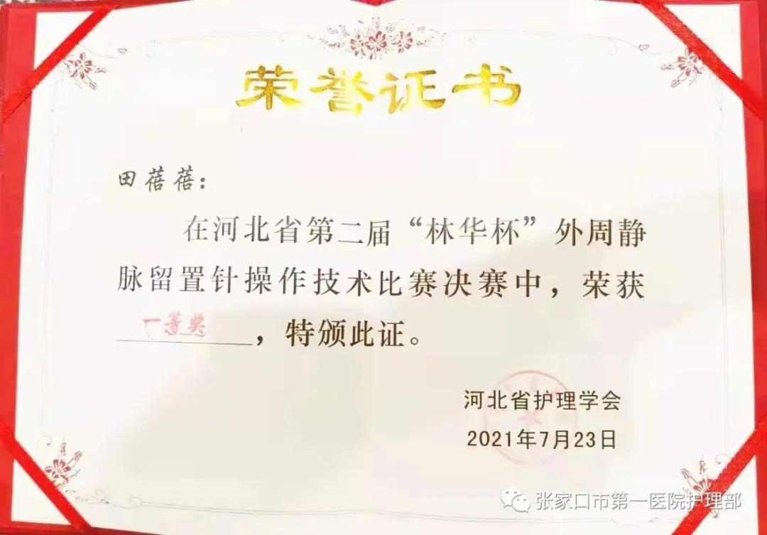 7月23日,在河北省护理学会举办的第二届“林华杯”外周静脉留置针操作技术比赛中,张家口市护理学会会员、市第一医院外科重症医学科护士田蓓蓓经过激烈角逐,取得了一等奖的成绩。