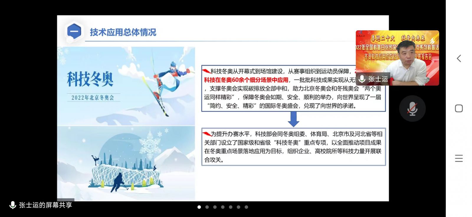 当前,张家口发展进入后奥运时代,冬奥科技成果的转化应用对于实现高质量发展具有关键作用和重要意义。为充分利用好张家口冬奥遗产,以科技冬奥成果的宣传普及和推广应用助推后奥运经济发展,9月22日,市科协以全国科普日活动为契机,特别邀请北京市科学技术研究院张士运博士围绕“冬奥科技应用成效及后奥运经济展望”主题,开展线上专题科普报告会。市科协党组书记、主席弓爱萍主持会议。